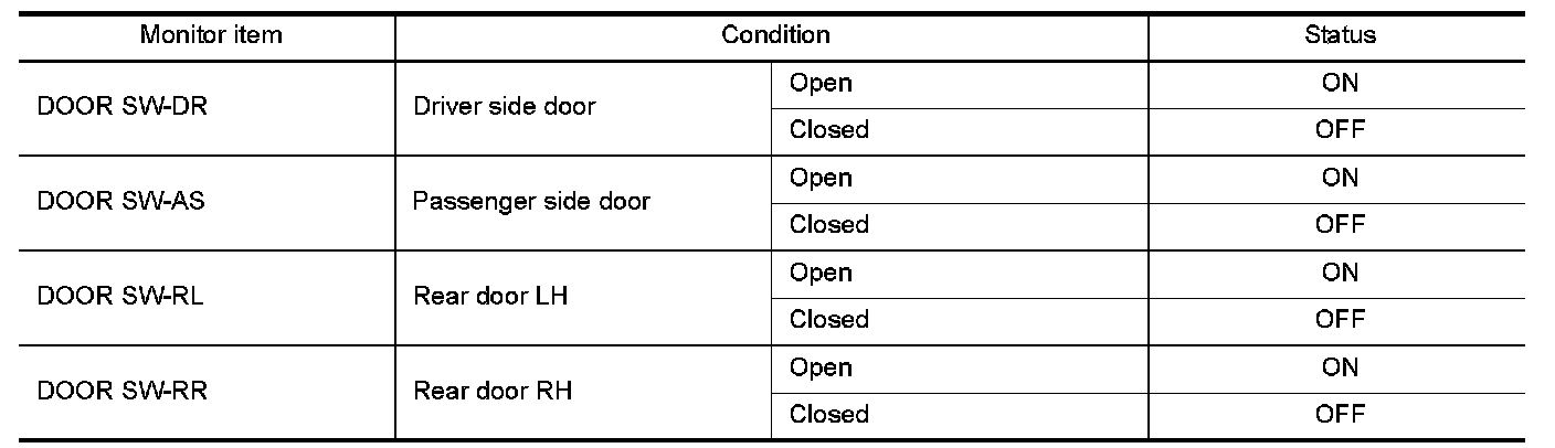 Check ("DOOR SW-DR", "DOOR SW-AS", "DOOR SW-RL" or "DOOR SW-RR") in "Data Monitor" mode with