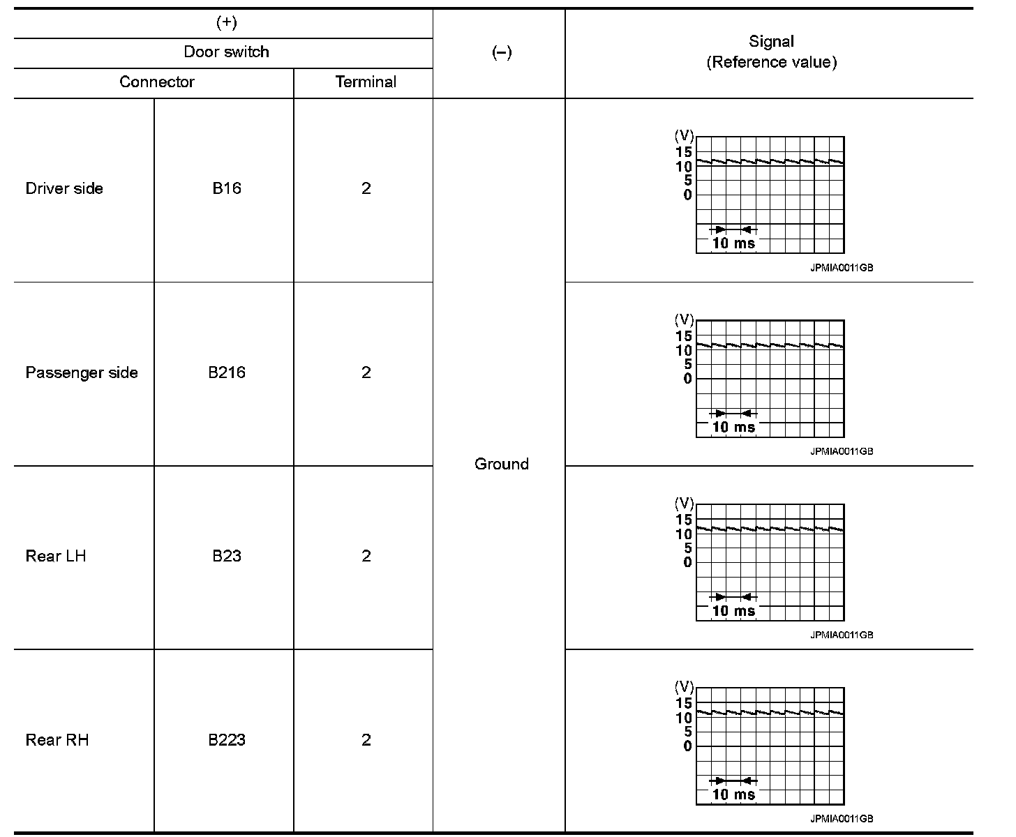 3.Check signal between malfunctioning door switch harness connector and ground with oscilloscope.
