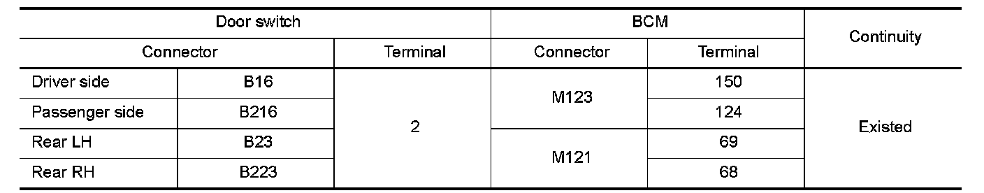 2.Check continuity between door switch harness connector and BCM harness connector.