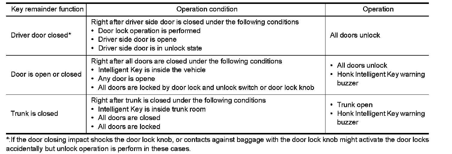 - The above function operates when the Intelligent Key is inside the vehicle. However, there may be times when the Intelligent Key cannot be detected, and this function does operate when the Intelligent Key is on the instrument panel, rear parcel shelf, or in the glove box. Also, this system sometimes does not operate if the Intelligent Key is in the door pocket for the open door.