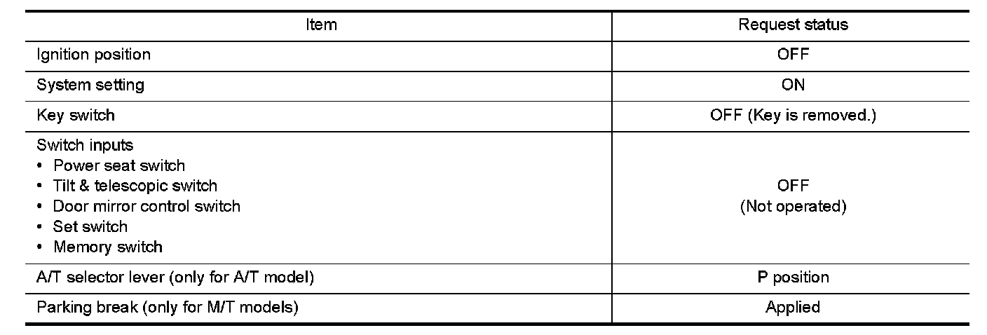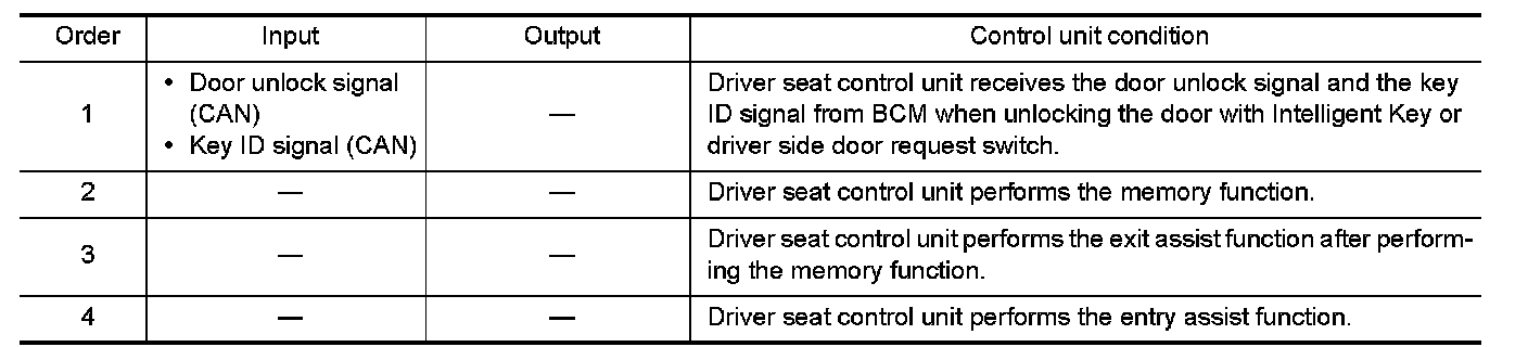When unlocking doors by using Intelligent Key or driver side door request switch, the system performs memory operation, exiting operation then entry operation.