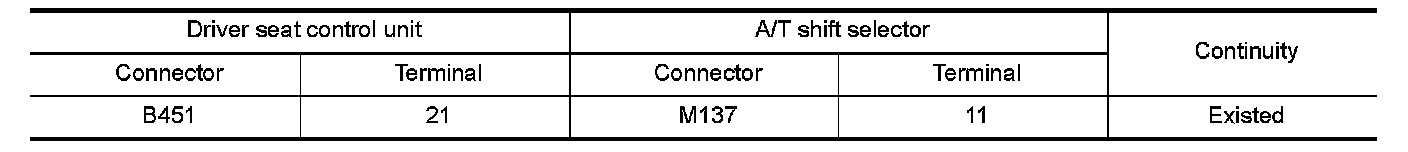 3.Check continuity between driver seat control unit harness connector and A/T shift selector harness connector.