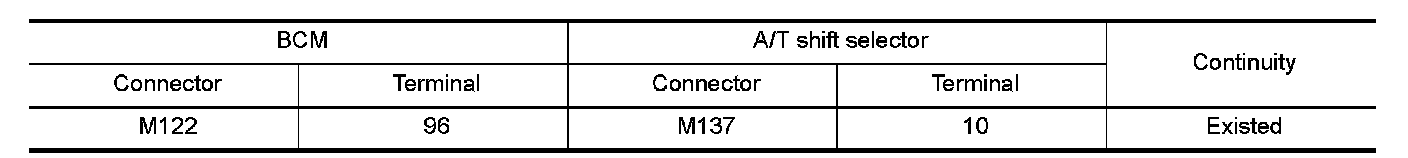 3.Check continuity between BCM harness connector and A/T shift selector harness connector.