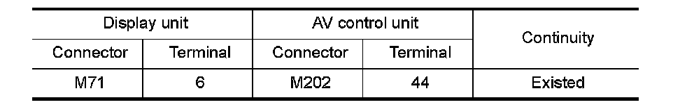 3.Check continuity between display unit harness connector and AV control unit harness connector.