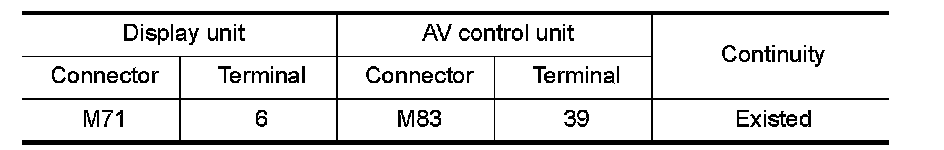 3.Check continuity between display unit harness connector and AV control unit harness connector.