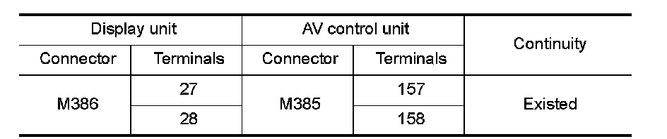 3.Check continuity between display unit harness connector and AV control unit harness connector.
