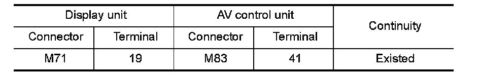 3.Check continuity between display unit harness connector and AV control unit harness connector.