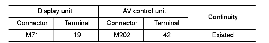 3.Check continuity between display unit harness connector and AV control unit harness connector.