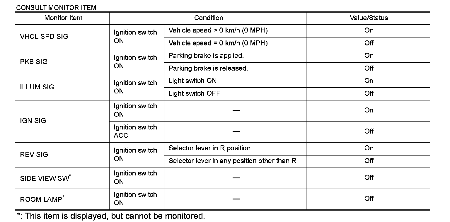 The following table includes information (items) inapplicable to this vehicle. For information (items) applicable to this vehicle, refer to CONSULT display items.