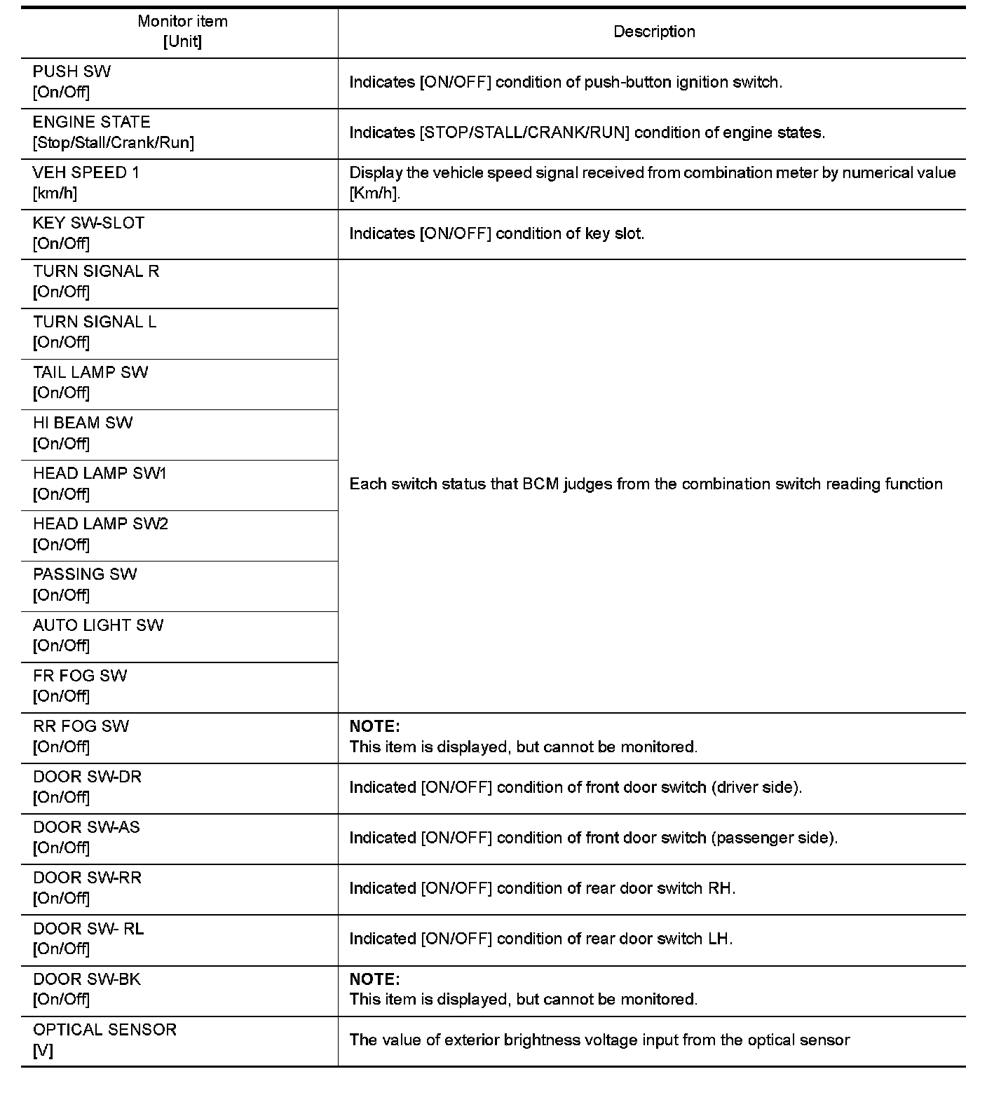 The following table includes information (items) inapplicable to this vehicle. For information (items) applicable to this vehicle, refer to CONSULT display items.