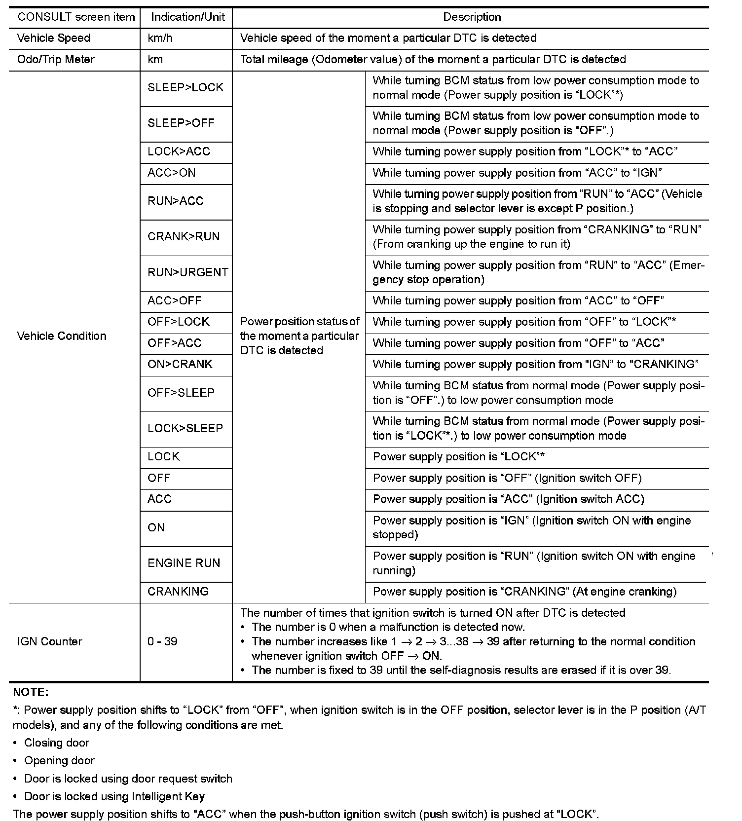 The BCM records the following vehicle condition at the time a particular DTC is detected, and displays on