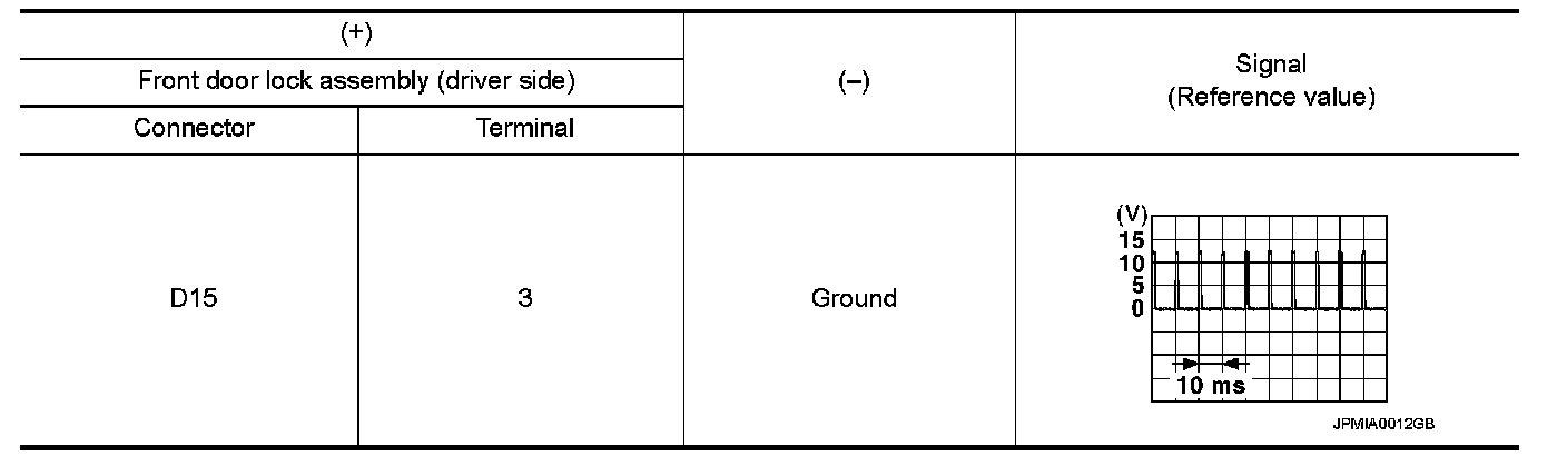 3.Check signal between front door lock assembly (driver side) harness connector and ground with oscilloscope.