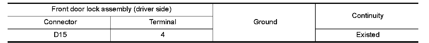 Check continuity between front door lock assembly (driver side) harness connector and ground.