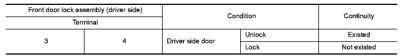 3.Check continuity between front door lock assembly (driver side) terminals.