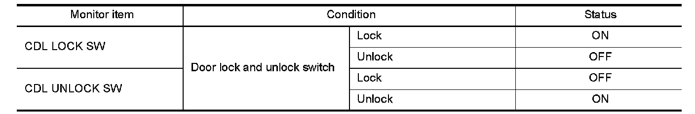 Check ("CDL LOCK SW ", "CDL UNLOCK SW") in "Data Monitor" mode with CONSULT.