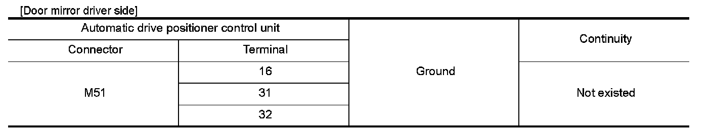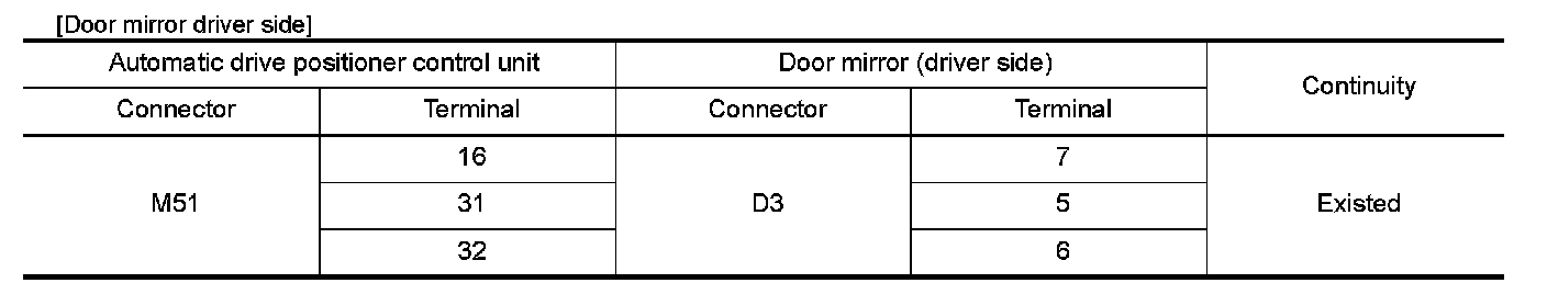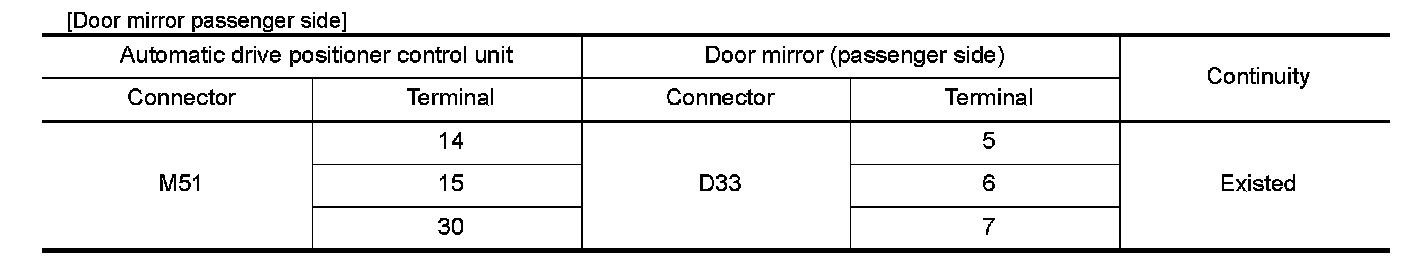 3.Check continuity between automatic drive positioner control unit connector and door mirror connector.