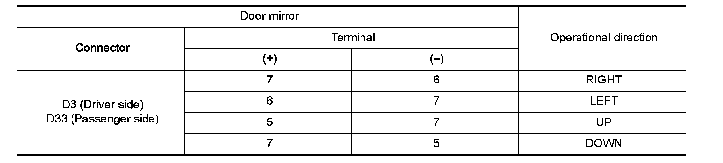 3.Supply door mirror motor terminals with battery voltage and check operation.