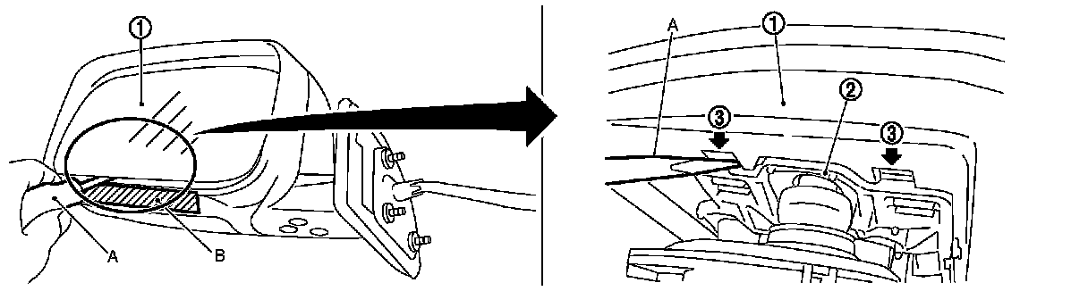 and actuator (2). Push up both pawls (3) simultaneously to remove glass mirror lower half side.