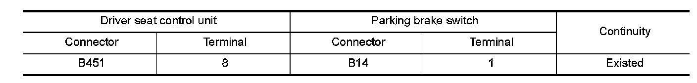 3.Check continuity between driver seat control unit harness connector and parking brake switch harness connector.