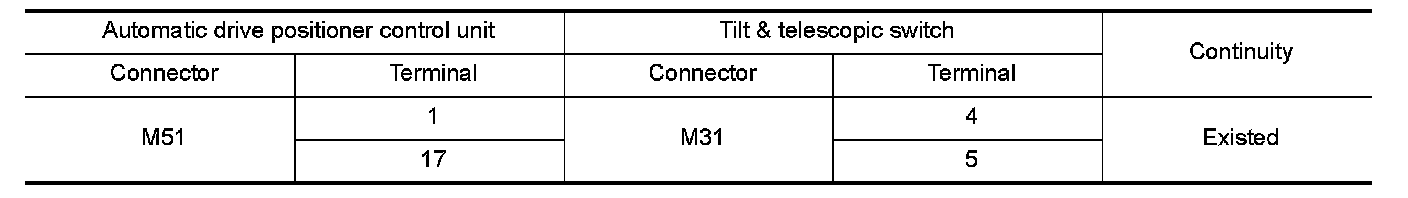 3.Check continuity between automatic drive positioner control unit harness connector and tilt & telescopic switch harness connector.
