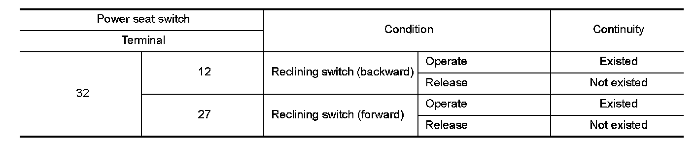 NO- Replace power seat switch. Refer to "Removal and Installation" Removal and Installation.
