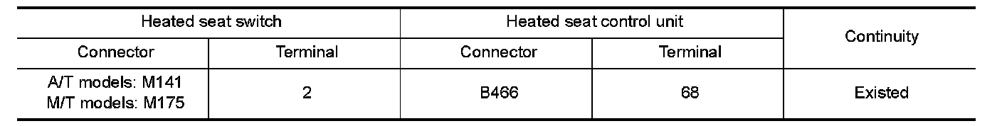3.Check continuity between heated seat switch harness connector and heated seat control unit harness connector.