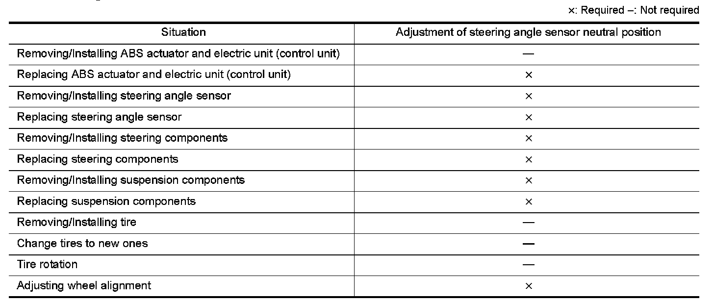 When doing work that applies to the list below, make sure to adjust neutral position of steering angle sensor before running vehicle.
