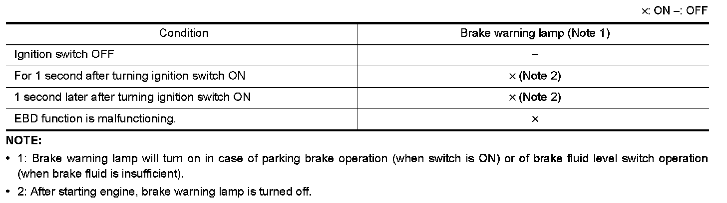 Check that the brake warning lamp in the combination meter turns ON/OFF correctly when operating the parking brake lever (M/T) or the parking brake pedal (A/T).