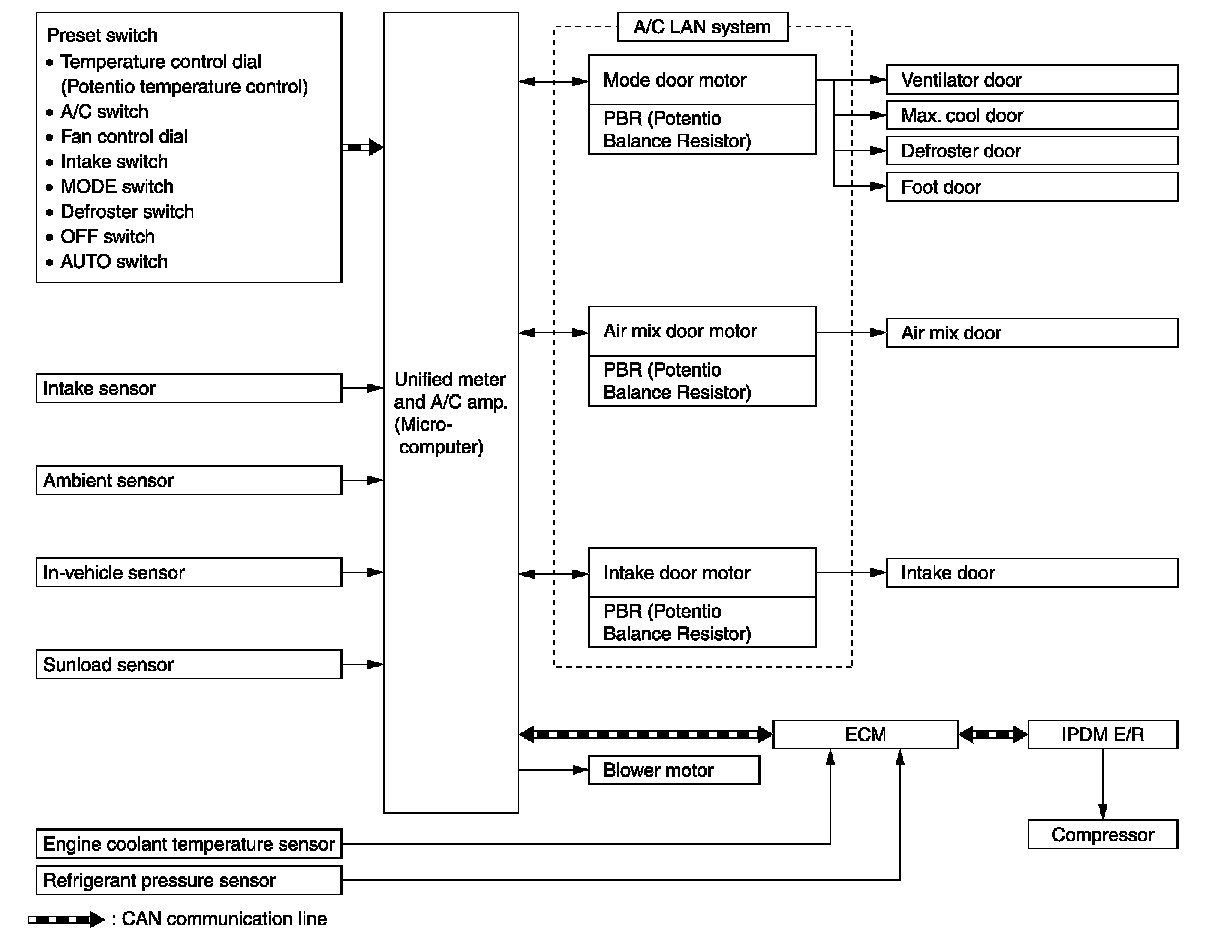 The control system consists of input sensors, switches, unified meter and A/C amp. (microcomputer) and outputs. The relationship of these components is as shown in the figure below: