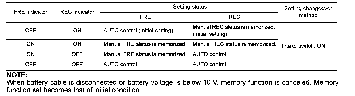 When battery cable is disconnected or battery voltage is below 10 V, memory function is canceled. Memory function set becomes that of initial condition.