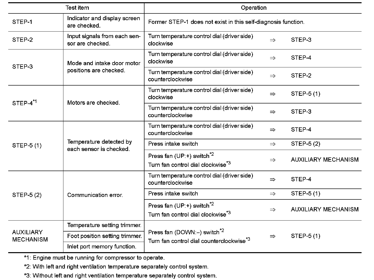 - If battery voltage drops below 12 V during diagnosis STEP-3, door motor speed becomes slower and as a result, the system may generate an error even when operation is normal. Start engine before performing this diagnosis to avoid this.