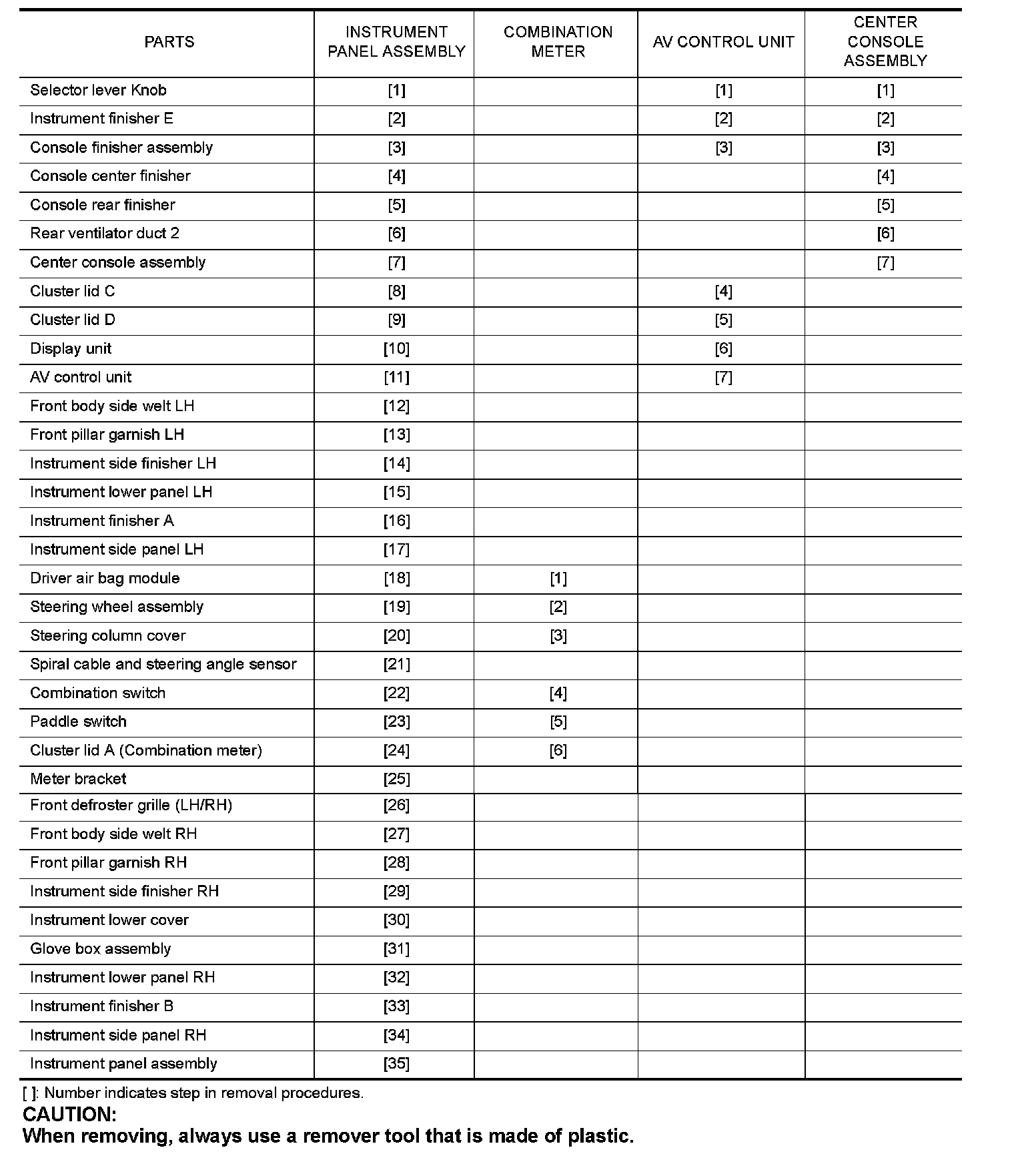 When removing instrument panel assembly, combination meter, AV control unit, center console assembly take steps in the order shown by the number below.