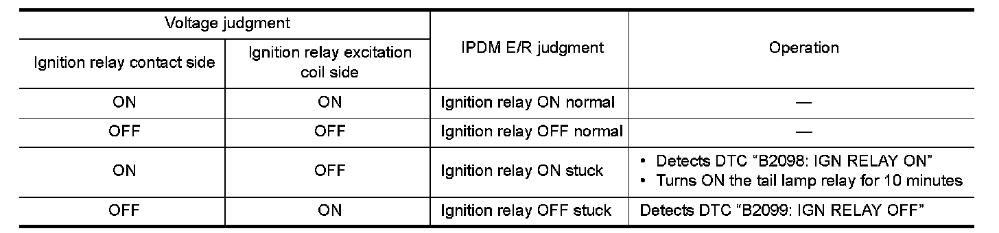 - IPDM E/R judges the ignition relay error if the voltage differs between the contact circuit and the excitation coil circuit.