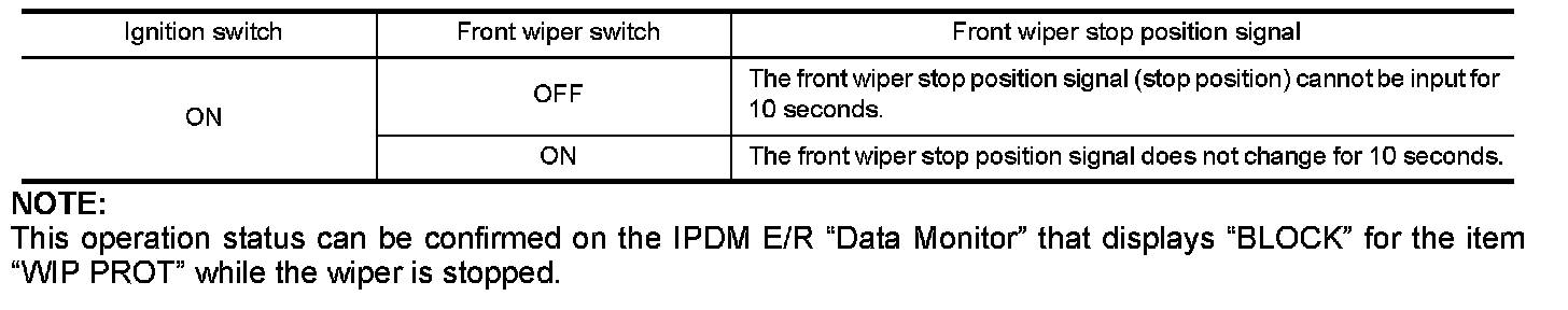 When a front wiper stop position signal is in the conditions listed below, IPDM E/R stops power supply to wiper after repeating a front wiper 10 seconds activation and 20 seconds stop five times.
