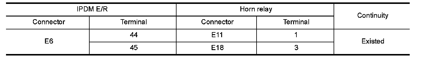 3.Check continuity between IPDM E/R harness connector and malfunctioning horn relay terminal connector.