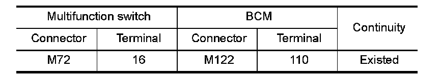 3.Check continuity between the multifunction switch harness connector and the BCM harness connector.
