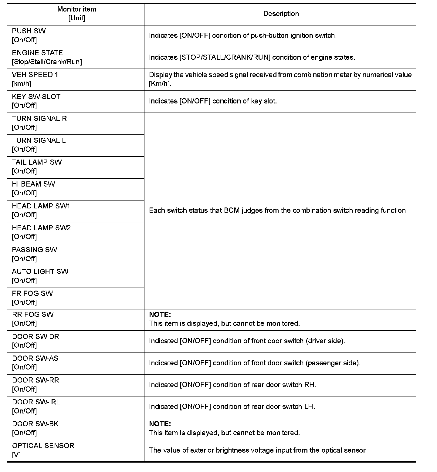 The following table includes information (items) inapplicable to this vehicle. For information (items) applicable to this vehicle, refer to CONSULT display items.