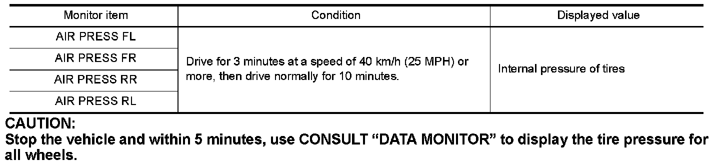 Stop the vehicle and within 5 minutes, use CONSULT "DATA MONITOR" to display the tire pressure for all wheels.