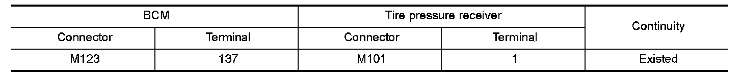 2.Check continuity between BCM harness connector and tire pressure receiver connector.