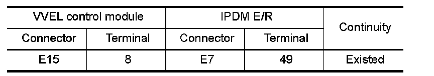 4.Check the continuity between VVEL control module harness connector and IPDM E/R harness connector.