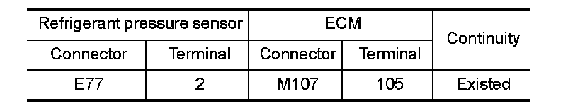 1.Check the continuity between refrigerant pressure sensor harness connector and ECM harness connector.