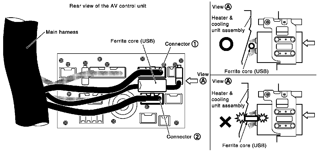 - Install AV control unit between connector (1) and connector (2) with the ferrite core (USB) orientated sideways to the vehicle. Incorrect installation may cause damage to the AV control unit.