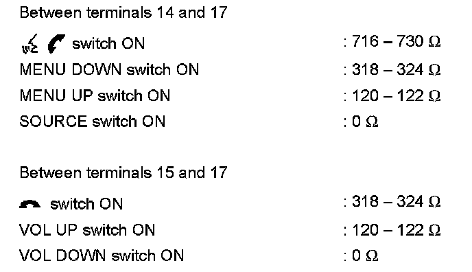 Measure the resistance between the steering switch connector terminals 14 to 17 and 15 to 17.