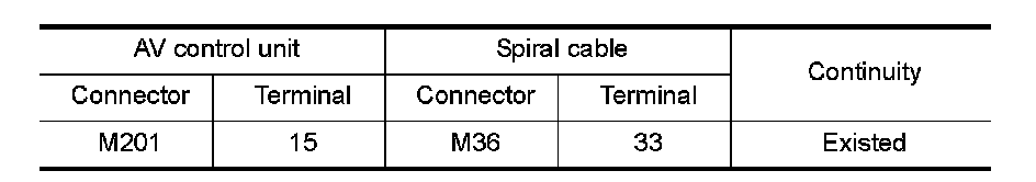 2.Check continuity between AV control unit harness connector and spiral cable harness connector.