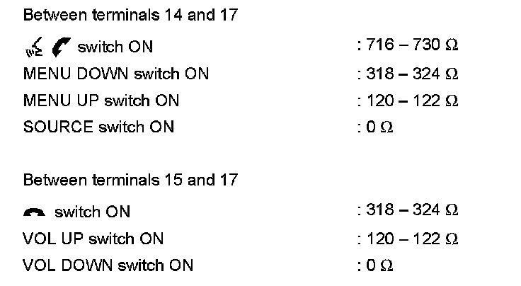 Measure the resistance between the steering switch connector terminals 14 to 17 and 15 to 17.