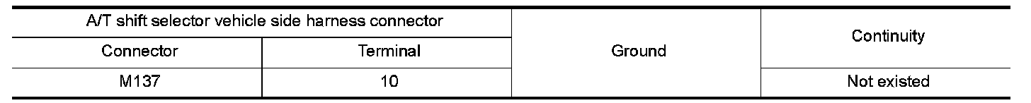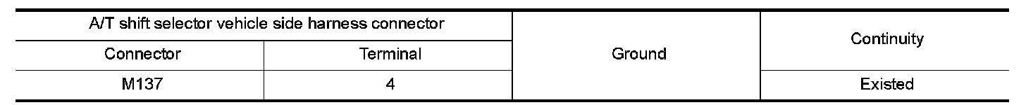 Check continuity between A/T shift selector vehicle side harness connector terminal and ground.