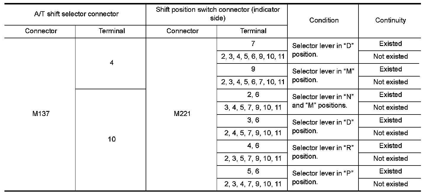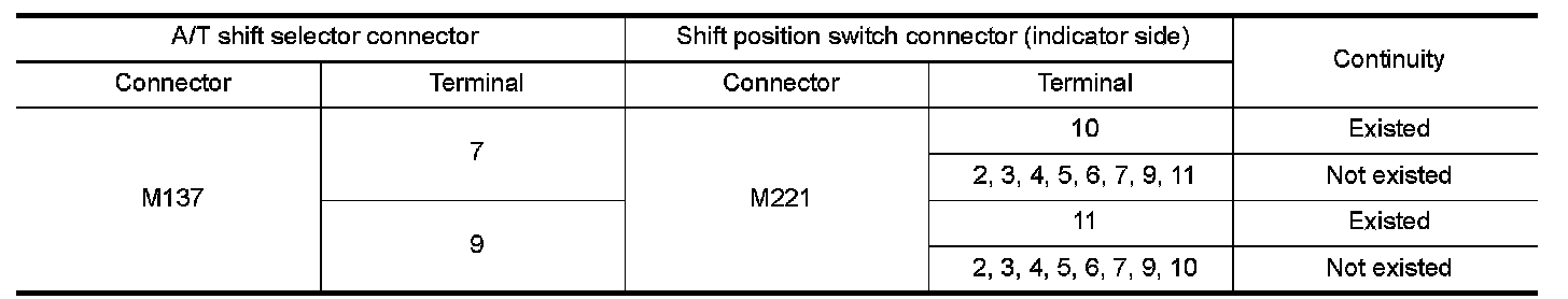2.Check continuity between A/T shift selector connector terminals and shift position switch connector terminals (indicator side).