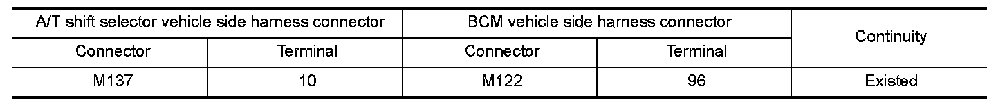 3.Check continuity between A/T shift selector vehicle side harness connector terminal and BCM vehicle side harness connector terminal.