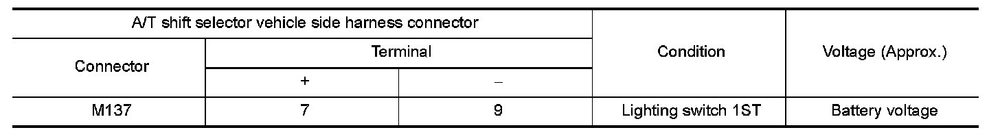 Check that the night illumination of the selector lever position indicator turns on when setting the lighting switch in 1st position.