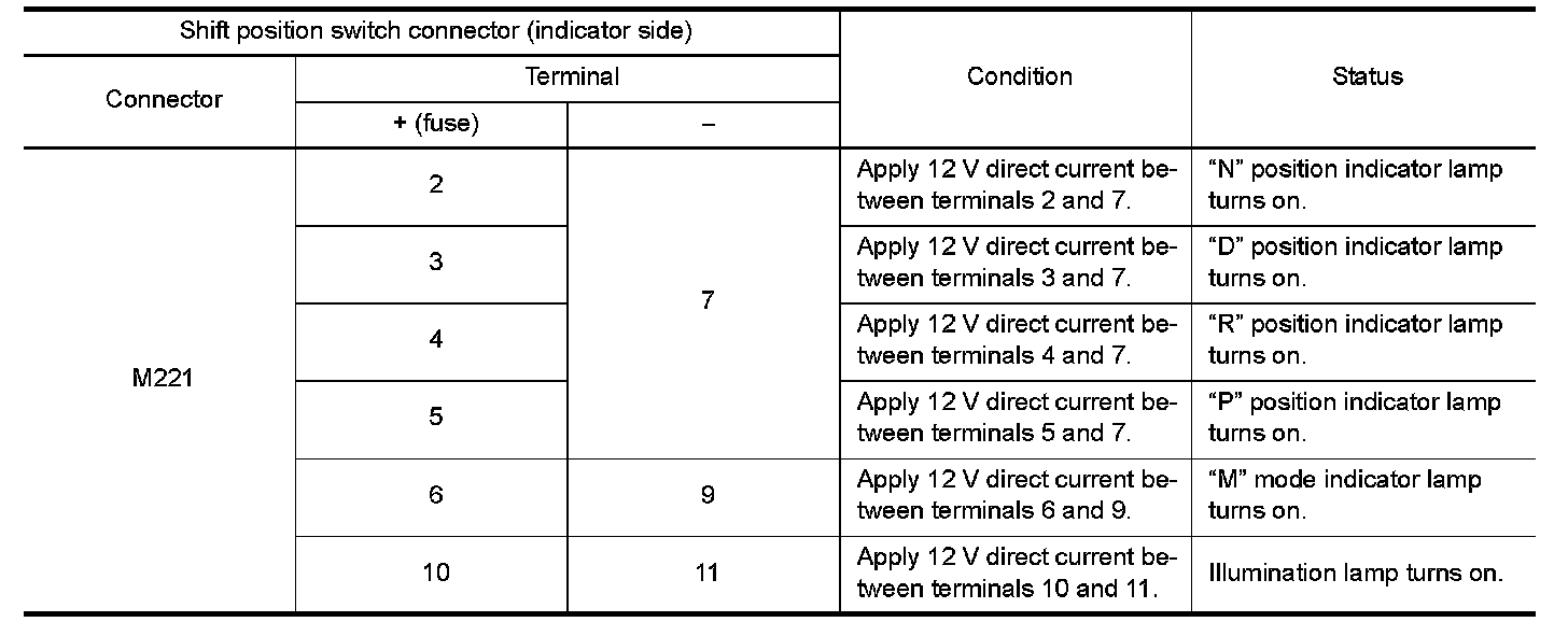 1.Disconnect selector lever position indicator side connector of shift position switch.